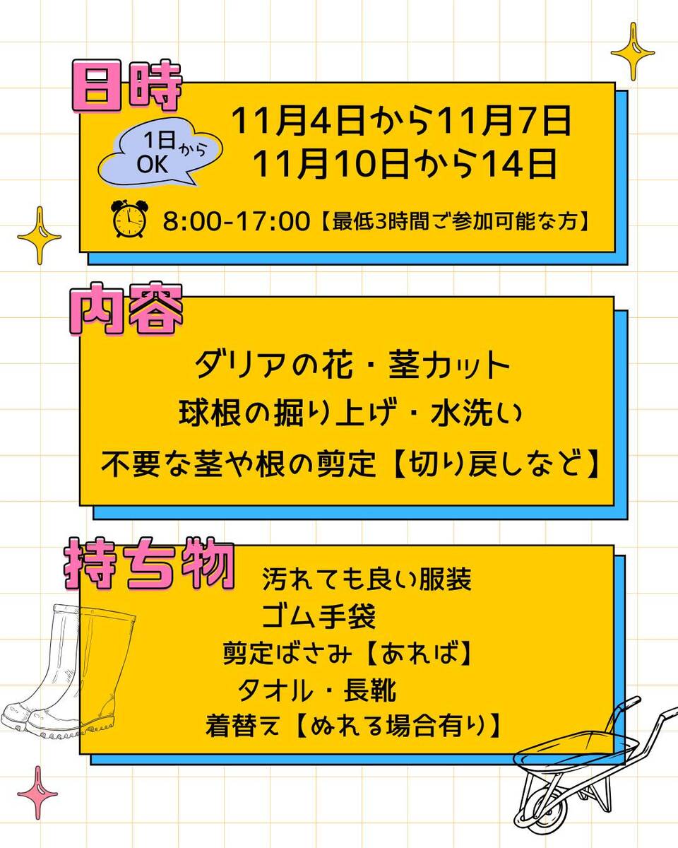 ダリアの掘り上げ・洗浄・剪定作業をお手伝いいただける村民の皆様を募集いたします♪